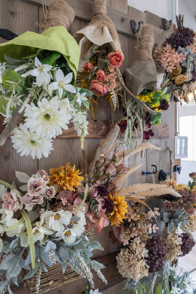 背景だけでなく、手持ちのアイテムや床材にもこだわっています。10組を超える手持ち用のドライフラワーをご用意しており、床材はカスミソウエリアにはカフェ板・その他は全て大判600角総タイル張り。2人がけのアンティークベンチやチャーチチェア。ヴィンテージチェア・アルミチェアなどもご用意があるので様々な撮影シーンに対応しています。