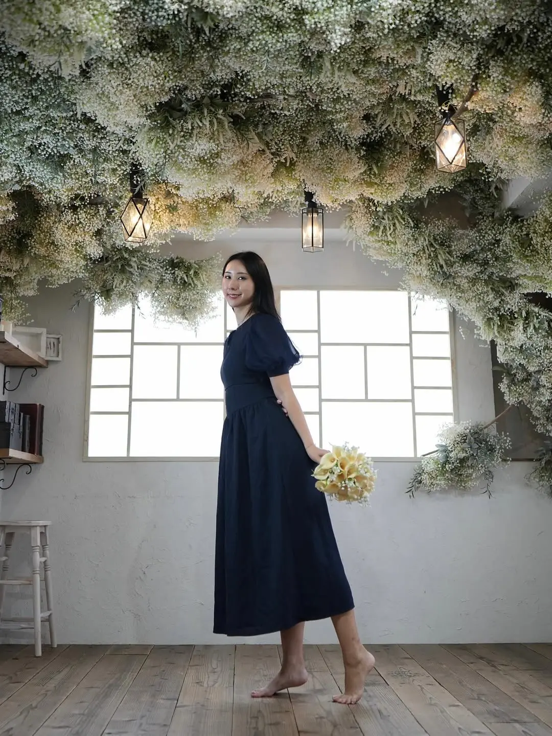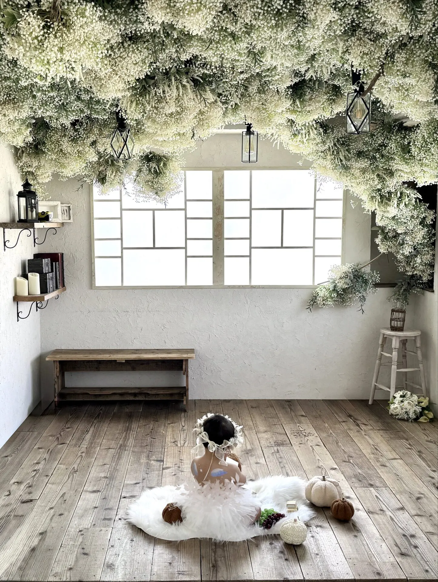 天井の1/3を埋め尽くすカスミソウドライフワラーを数千本使用した幻想的空間。質感にこだわった漆喰の壁と天井・自然光が差し込む窓も格子状にあしらってさまざまな撮影の背景として活用いただけます。